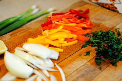 Dip diced avocado in fresh lime juice for a few seconds and drain. This will keep the avocado from turning brown and you can prepped the veggies several hours ahead before serving. Add chopped cilantro and green onions, tossed with fresh lime juice and plenty of salt and pepper. Grilled French bread rounded off this simple meal perfectly! Here, wanna bite?