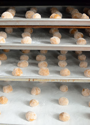 After a bit of chilling in the fridge, the dough balls are dipped in sugar and then baked.