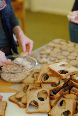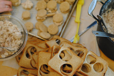 Our condo living room was transformed to a prep kitchen. Since bread is bulky and too delicate to transport, we purchased the bread at Williamsburg and cut the bread rounds with cookie/biscuit cutters.