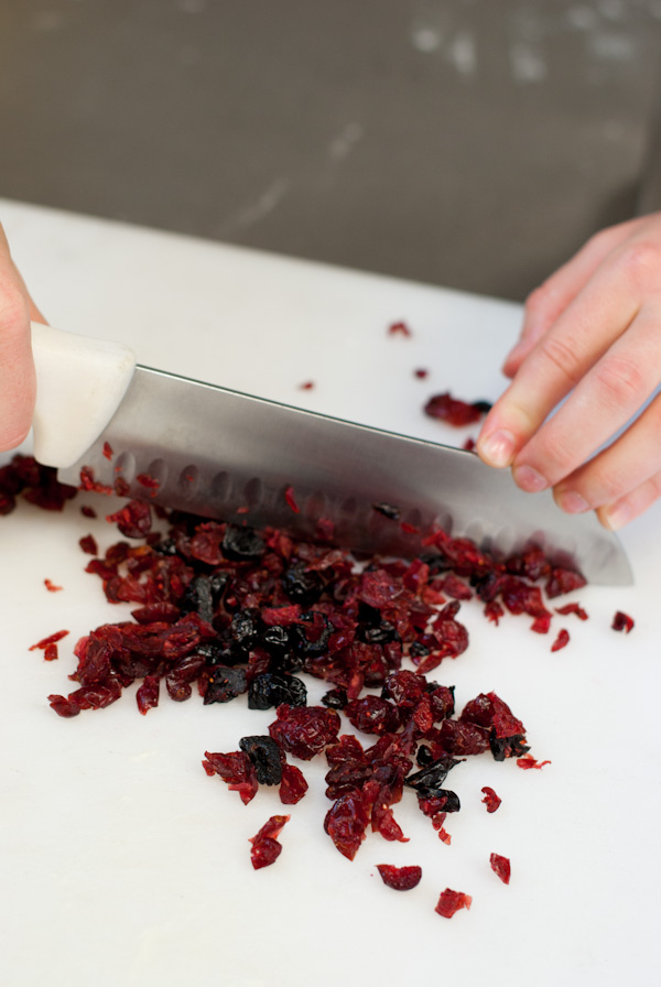 Chop dried cherries and cranberries.
