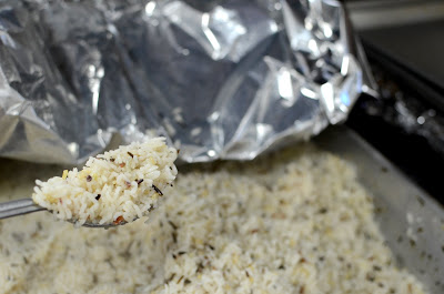 Back to the rice pilaf, using two sheets of foil, cover the roster pans tightly and seal the edges. Place a full sheet pans over the foil to keep it in place. Cook in high heat until you see steam escape on the side, about 10-15 minutes, depending on the amount of rice. Reduce heat to simmer and let steam for 20-30 minutes. Do not uncover the foil top at anytime during steaming.
