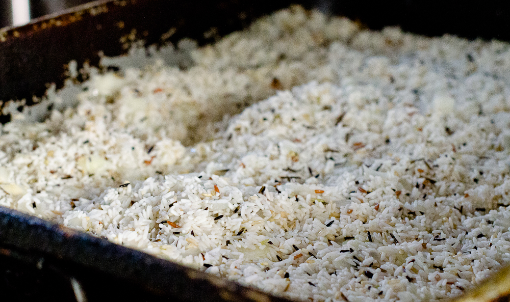 To add some texture and flavor, four pounds of wild and brown rice blend was mixed to long grain rice. Rinse rice in cold water, then soak for 15-30 minutes. This water absorption reduces the cooking time.