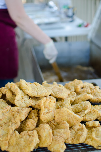 Frying 60 pounds of fish well is no easy task. This borrowed cooker (Thank you, Mr. Joe!) holds 70 pounds of frying oil and maintains the temperature perfectly. The cornmeal coated Swai comes out tender inside and super crunchy outside. But boy, it gets pretty hot near the blazing propane burners; this is where my staff Cheryl and I get our oil/sweat facials, sort of like Oil of Olay.
