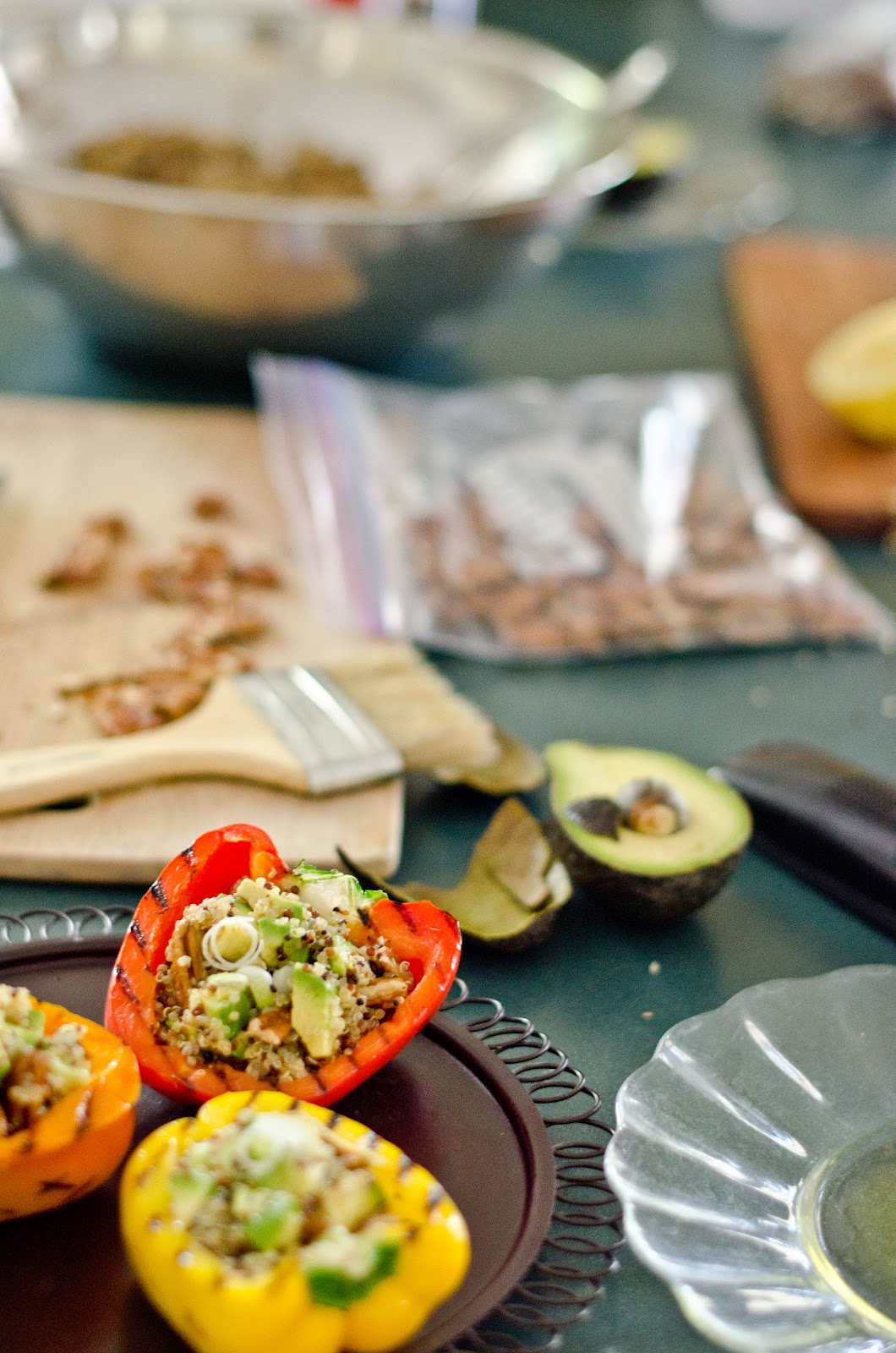 Optional: 6 halves of multi-colored peppers, grilled to fill the quinoa salad (lightly coat peppers with olive oil, salt & pepper, then grill)