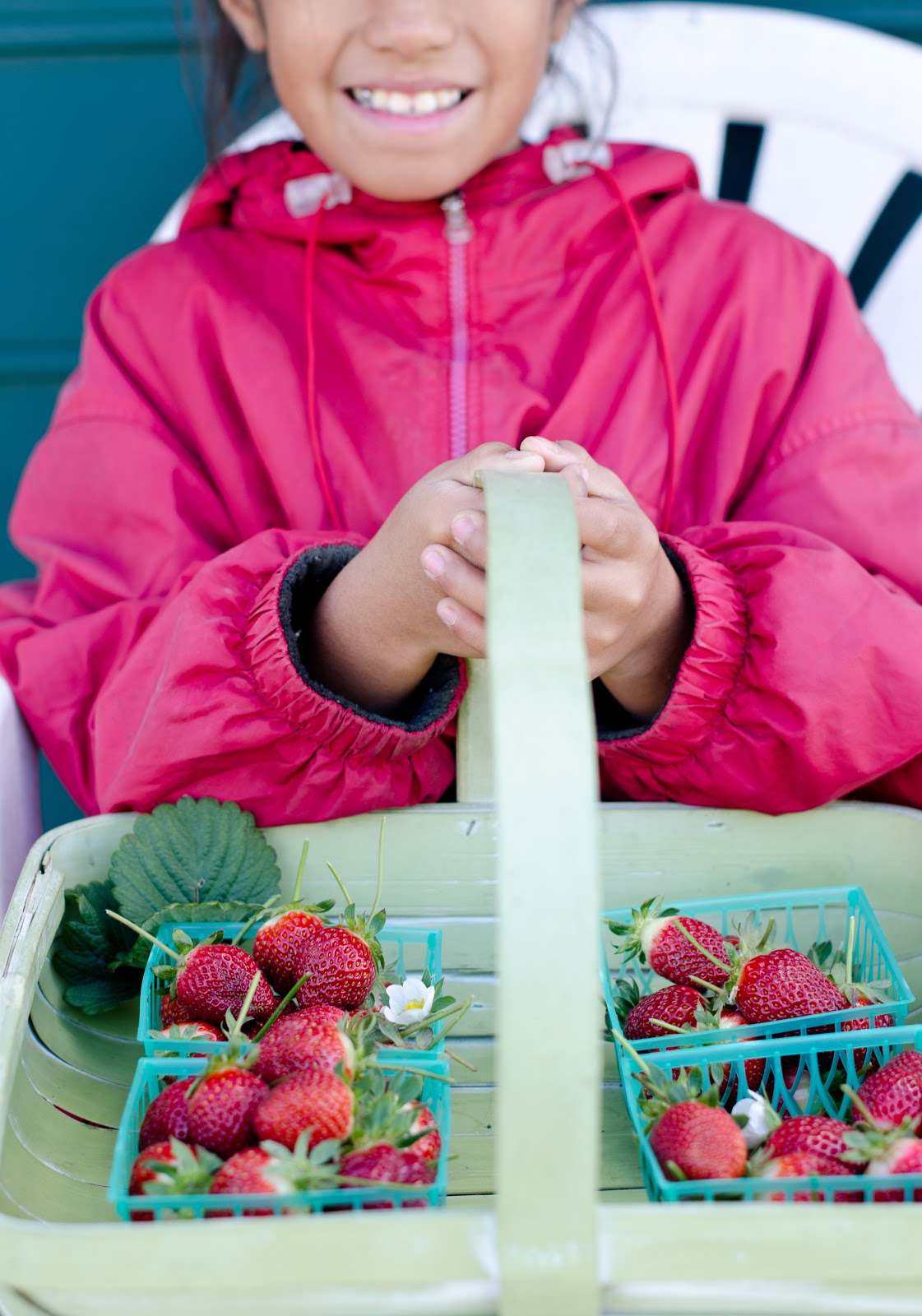 I handed her a few pint-size baskets and asked if she could help me pick some not-so-big, red, shiny, pretty, stemmed berries. Â Despite my numerous adjectives, she flashed me a smile and hopped over the beds like a graceful fawn and went to work. Â