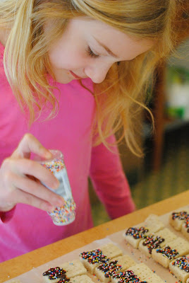 Dip shortbread in melted chocolate (also can be drizzled using a pastry bag or ziplock baggie with cut corner), shake colorful sprinkles on to adhere