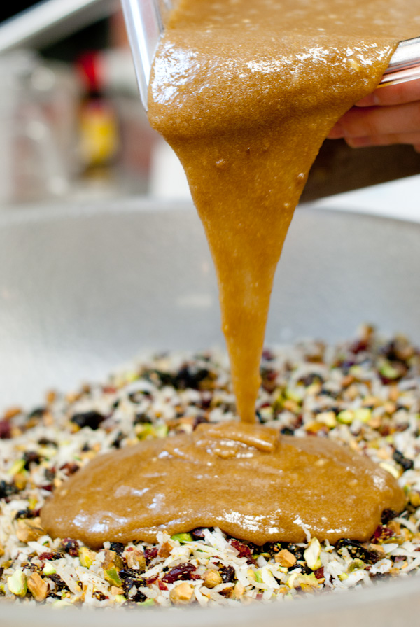 Mix nuts, dried fruit, and coconut with egg and maple syrup mixture.