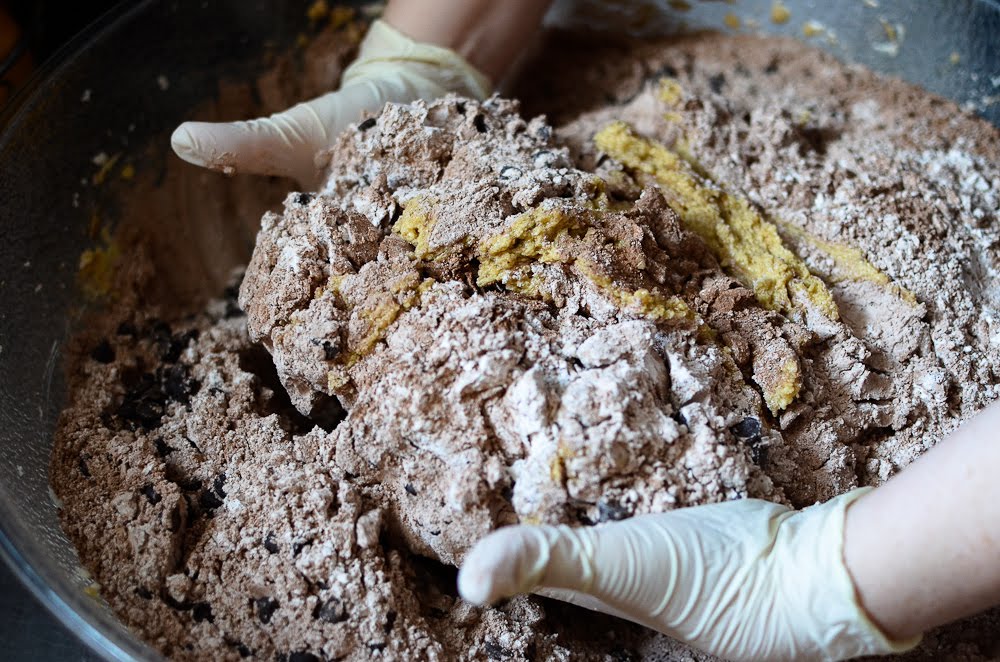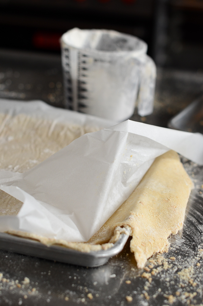 Massive amount of dough was divided into flat 16 rectangular dough blocks and chilled well in the refrigerator. Then it was time to roll these babies out. Sprinkle flour and ground animal cracker crumbs generously on the parchment paper, center it on the paper and begin rolling the dough out: from center, outward.