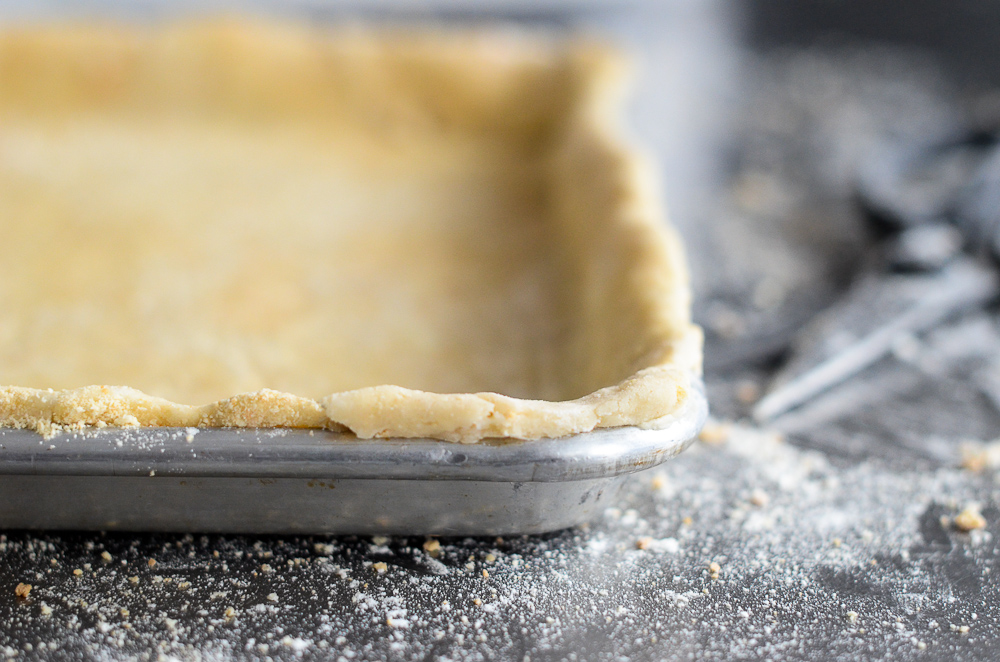 1. Divide the dough into two pieces. Shape each piece of crust into a rectangle, cover, and chill for an hour. Take the first piece of pastry out of the fridge, and put it on a floured parchment paper on top of work surface. Generously sprinkle with animal cracker crumbs. Roll it into a large rectangle a bit larger than your pan you are using. Trim the dough to fit the pan and patch the corners with access dough if needed